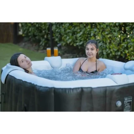 Composition du lot : 1 spa, 1 couverture isolante, 1 pompe, 1 cartouche de filtration (VI), 1 diffuseur ChemConnect, 1 bande lumineuse LED, 4 appuie-tête, 1 patch de réparation