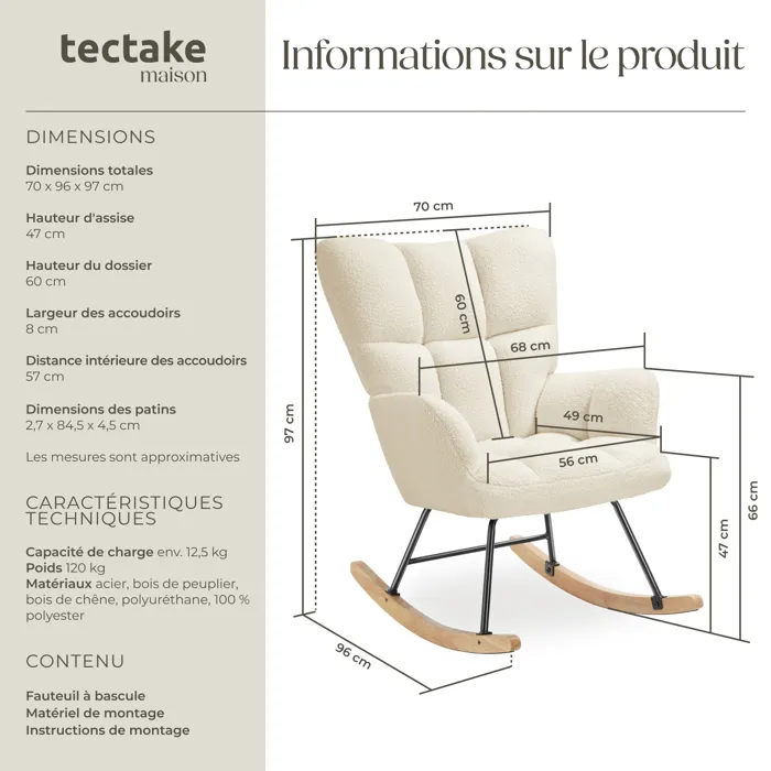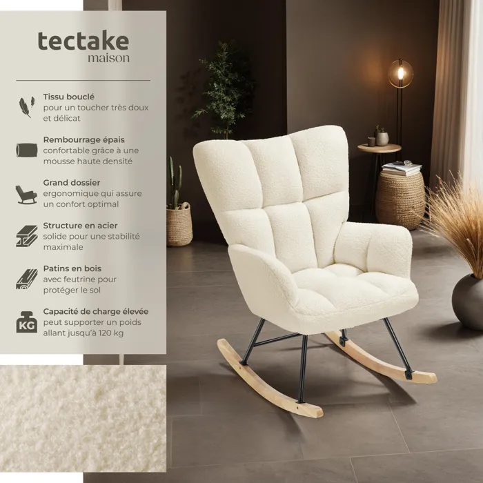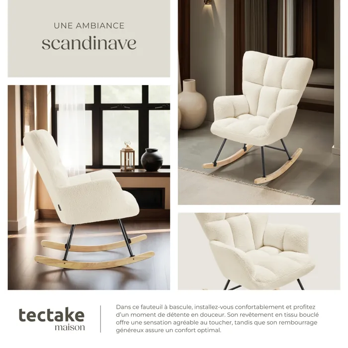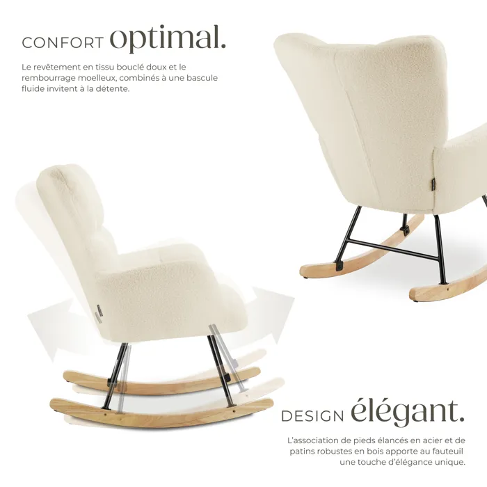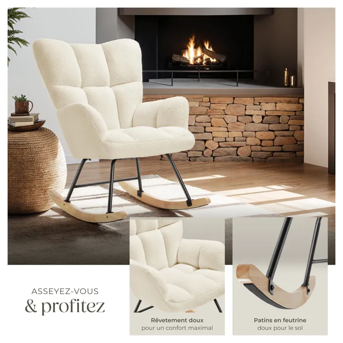 Fauteuil à bascule confortable au style scandinave chaleureuxRevêtement en tissu bouclé doux avec motif matelassé élégantRembourrage confortable grâce à sa mousse haute densitéGrand dossier et larges accoudoirs pour un confort optimalStructure en acier robuste pour une stabilité maximale et une capacité de charge élevéePatins en bois massif doux pour le solMontage rapide