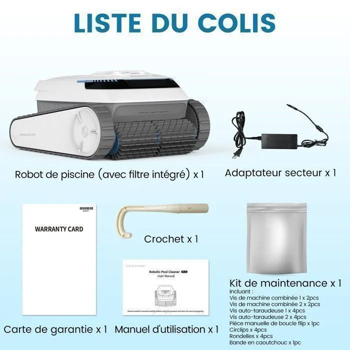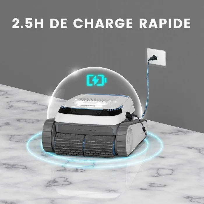 Conception sans fil pour plus de sécurité et de praticité : Contrairement aux robots nettoyeurs de piscine filaires traditionnels, l’aspirateur de piscine AIRROBO élimine les problèmes de câbles et de tuyaux emmêlés, pour une utilisation plus sûre et plus pratique. Trois modes de nettoyage : Mode automatique, mode fond uniquement et mode parois uniquement. Performances de nettoyage exceptionnelles : Deux moteurs d’entraînement et une pompe à eau, associés à un filtre fin de 180 microns, collectent et filtrent efficacement les impuretés et les débris, pour une eau cristalline. Jusqu’à 120 minutes d’autonomie et grande mobilité : Batterie haute performance intégrée de 5 200 mAh. Navigation intelligente pour un nettoyage complet : Grâce à un positionnement précis et à une technologie de navigation intelligente, cet appareil nettoie la piscine en suivant un parcours en arc de cercle, assurant une couverture optimale de chaque recoin pour un nettoyage ultra-efficace.