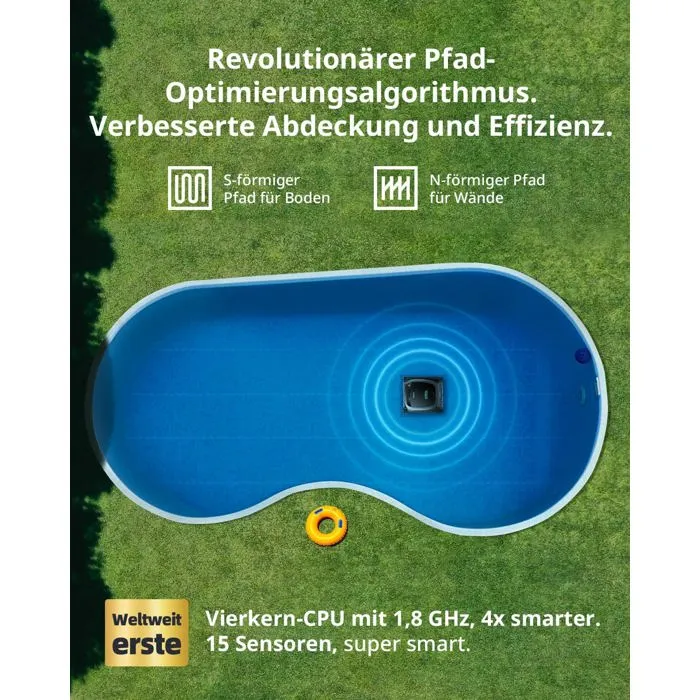 Algorithme d’optimisation de chemin intelligent : le robot est alimenté par un processeur quadricœur de 1,8 GHz et dispose de 15 capteurs et d’algorithmes d’IA, ce qui permet au robot de cartographier avec précision votre piscine autonome ou encastrée, d’optimiser le chemin de nettoyage et, en combinaison avec l’évitement d’obstacles SonicSense, une navigation efficace même dans l’environnement de piscine le plus complexe. garantis. Nettoyage puissant et escalade sur les murs : le moteur de pompe principale sans balais robuste de 200 W a une puissance d’aspiration massive de 5500 GPH, grimpant efficacement les murs, même incurvés, et attrape la saleté dans le panier filtrant ultra fin de 150 μm. Système de double brosse pour une double efficacité de nettoyage et une couverture : le robot est équipé de 2 x 2 brosses à rouleaux indépendantes – une paire à l’avant et une paire à l’arrière – qui assurent un contrôle précis dans les virages et une grande couverture de la zone à nettoyer. En combinaison avec un système d’entraînement à double piste, il offre une mobilité supérieure et une efficacité de nettoyage inégalée. Chemins de nettoyage en forme de N et en forme de S : prend en charge les chemins de nettoyage en forme de N et en S. L’aspirateur de piscine pour piscines enterrées choisit de manière intelligente le chemin de nettoyage optimal sur les murs et les sols, ce qui vous permet de bénéficier d’une efficacité maximale. Entièrement sans fil : nettoie le sol, les murs et la ligne d’eau sans fil. AquaSense offre 3 heures de nettoyage du sol avec une seule charge de batterie selon les laboratoires Beatbot. En outre, ce robot de nettoyage de piscine est livré avec une station de charge sans fil pour un chargement pratique. Sécurité et fiabilité exceptionnelles : l’AquaSense dispose de 15 certifications ETL, CEC et IP68, ce qui garantit sécurité et respect de l’environnement.