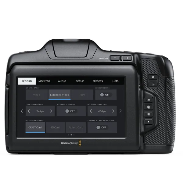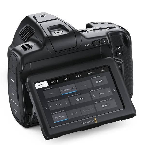 La Blackmagic Pocket Cinema Camera 6K Pro intègre des fonctionnalités professionnelles supplémentaires, telles que des filtres gris neutre à 2, 4 et 6 diaphragmes et un écran LCD HDR inclinable offrant une luminosité de 1500 nits pour les tournages en plein soleil. Elle comprend également deux entrées audio mini XLR et une plus grande batterie de type NP-F570.