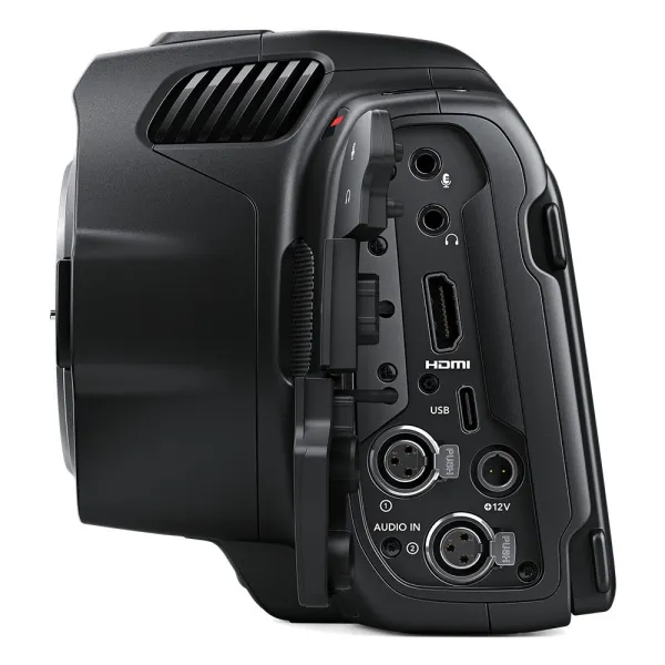 Bien qu’elle soit petite et mobile, la Blackmagic Pocket Cinema Camera intègre de nombreuses connexions pour l’audio, le monitoring, l’alimentation et bien plus. La caméra intègre un connecteur HDMI grand format pour le monitoring avec une prise en charge HDR et une sortie 10 bits. Ainsi, vous pouvez connecter des écrans HDMI pour le monitoring des images sur le plateau avec ou sans les informations d’état à l’écran. Elle inclut également une connexion mini XLR avec 48 volts d’alimentation fantôme pour brancher des micros professionnels, une entrée 3,5 mm pour les micros caméras, une connexion pour le casque et un connecteur d’alimentation DC professionnel. Enfin, la connexion USB-C vous permet d’enregistrer directement sur un disque externe !