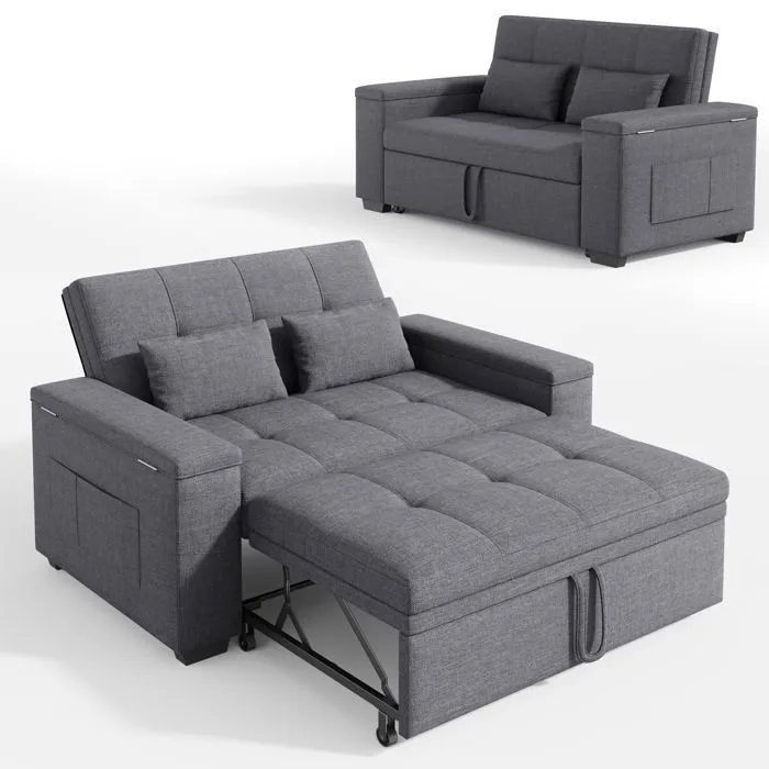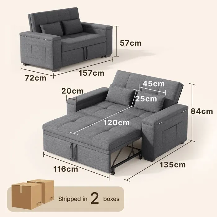 Ce canapé convertible deux places se transforme en canapé, canapé-lit et chaise longue. Confectionné en tissu de lin résistant et respirant, il est doté d’un cadre stable en métal et bois pour une robustesse durable. Il comprend 2 coussins en mousse, 2 poches latérales, 2 rangements d’accoudoir et 4 roulettes fluides, le tout dans un design pratique. Livré en 2 colis séparés pour un transport facile. Il répond à divers besoins : réception, détente, couchage temporaire.