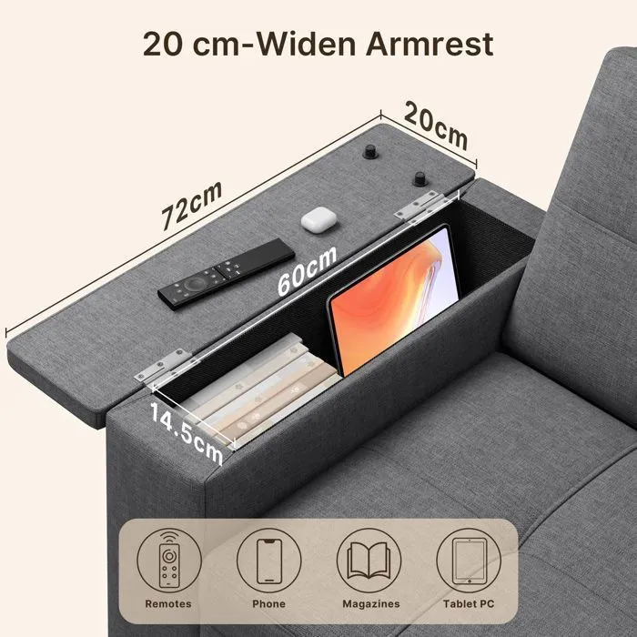 Plus produit : Ce canapé convertible 2 places avec compartiments de rangement intégrés dans les 2 accoudoirs