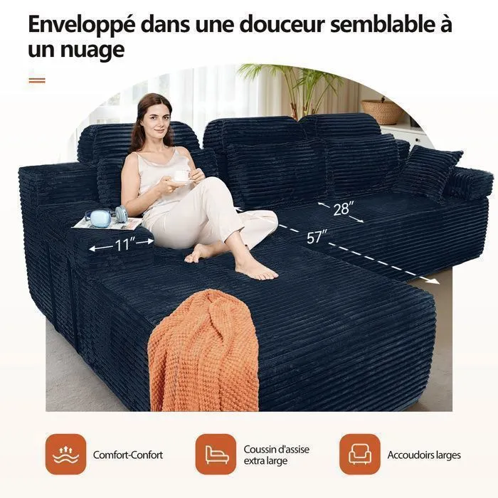 Surdimensionné pour le confort : Ce canapé spacieux dispose d’une assise profonde et d’un dossier plus large qui épouse les courbes du corps. Le rembourrage en mousse haute résilience offre un soutien solide et vous permet de rester assis longtemps sans vous affaler, vous donnant ainsi l’impression d’être comme dans un nuage.