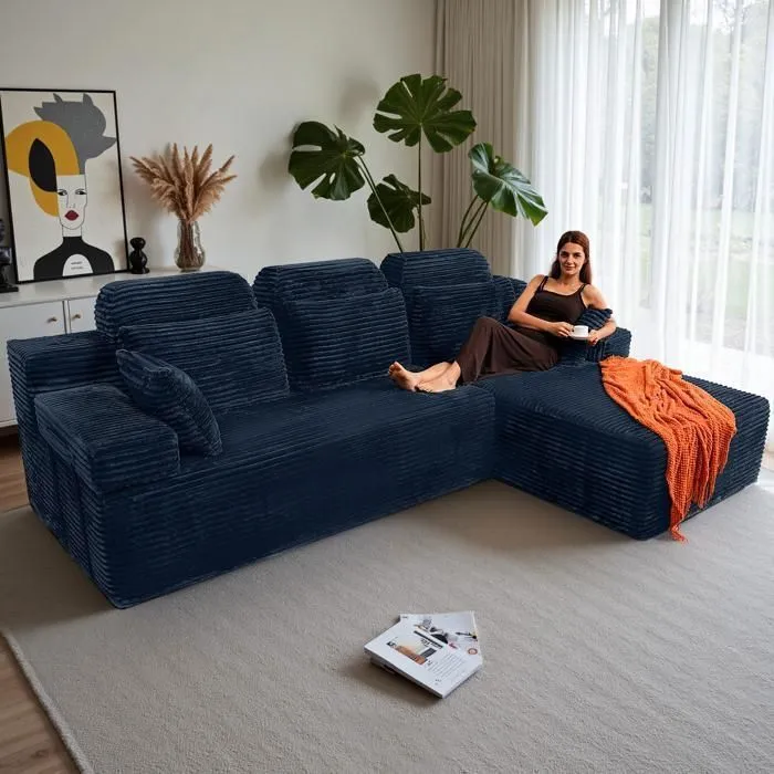 Tissus doux et agréables pour la peau : Le canapé d’angle est disponible en velours côtelé respirant. Chaque texture moelleuse est délicate et douce, ajoutant chaleur et sophistication à votre intérieur, tandis que le matériau durable et de haute qualité assure un confort durable au fil des saisons.