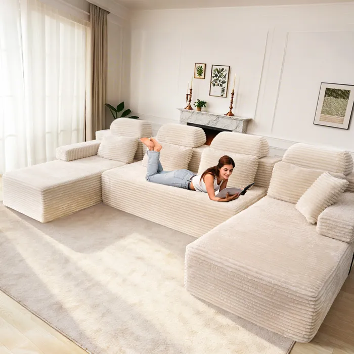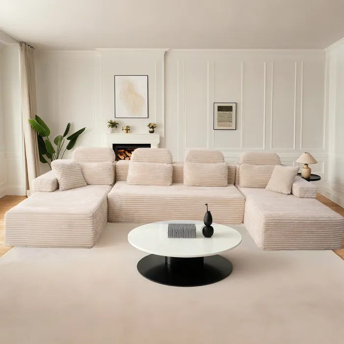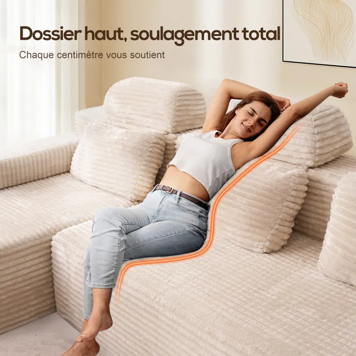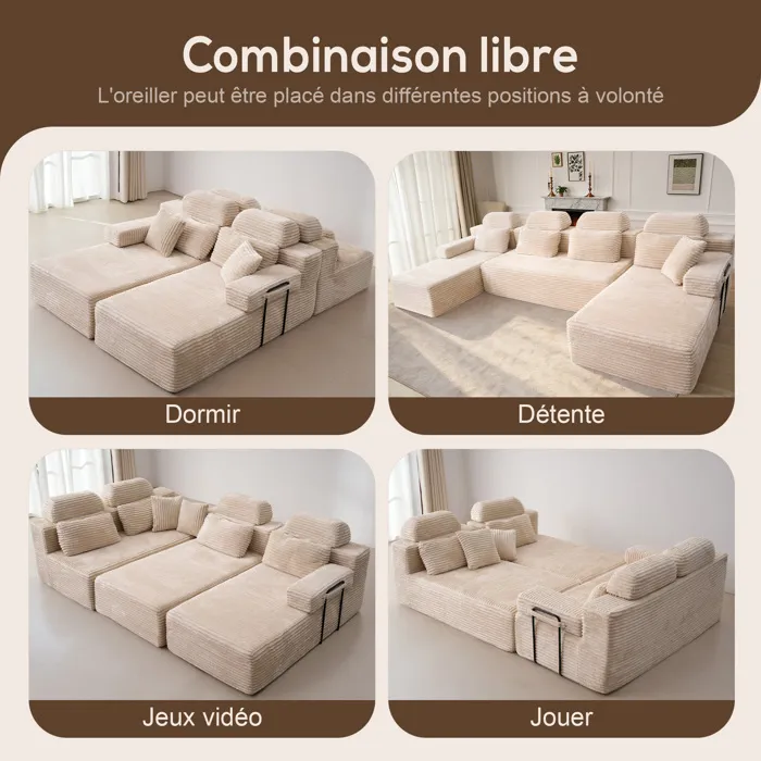 Canapé modulaire super grand en U avec 2 méridiennes, confortable en velours côtelé mousse à mémoire de forme,sans assemblage beige