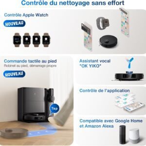 | Caractéristiques | Automatic Dust Collection, Intelligent Mop Lifting, Auto Mop Washing, Self-Refilling, Advanced Custom Cleaning |