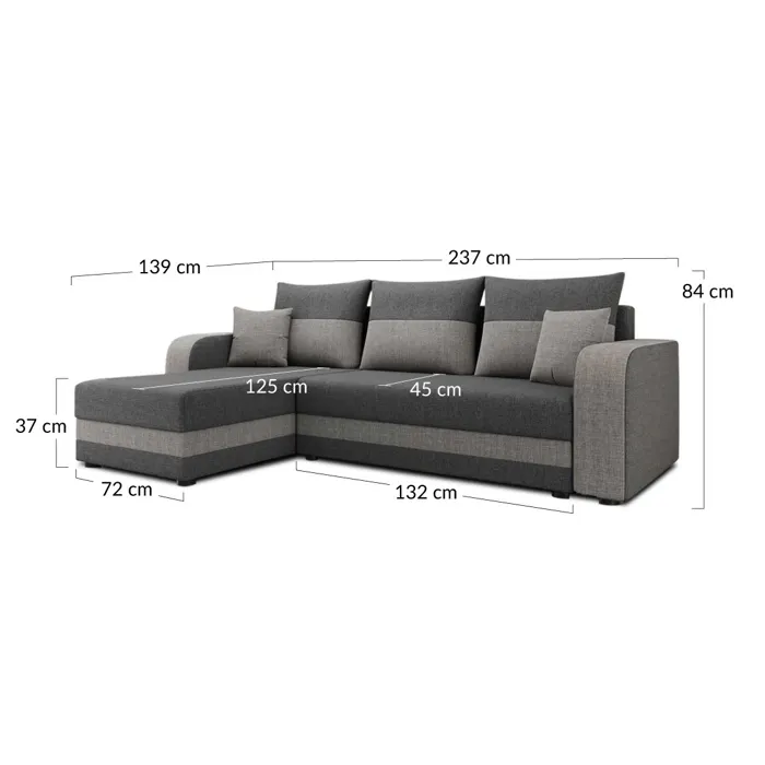 Description techniqueNombre de places : 4Position de l’angle : canapé réversible, vous positionnez votre angle à gauche ou à droite selon votre envie.Fabrication : EuropeConvertible : Oui (conçu pour un couchage d’appoint)Coffre de rangement : OuiStructure composée de bois massif et panneaux de particulesAssises garnies de mousse polyuréthanne de densité 28Kg/m3Dossiers garnis de mousses polyuréthanne de densité 25Kg/m3Suspension : Ressorts zigzagRevêtement en tissu 100 % polyesterPieds plastiqueA assembler en quelques dizaines de minutes, notice fournieDimensions du canapéDimensions hors tout : L237xH84xP139 cmLargeur : 237 cmHauteur : 84 cmProfondeur : 139 cmHauteur sans coussins : 64 cmProfondeur de la méridienne : 139 cmHauteur d’assise : 37 cmTaille du couchage : 204×130 cmProfondeur d’assise centrale avec coussins : 45 cmProfondeur d’assise centrale sans coussins : 70 cmProfondeur d’assise méridienne avec coussins : 100 cmProfondeur d’assise méridienne sans coussins : 125 cmLargeur d’assise de la méridienne : 72 cmLargeur d’assise canapé : 132 cmHauteur des pieds : 2,5 cmHauteur des accoudoirs : 56 cmLargeur des accoudoirs : 16 cmProfondeur des accoudoirs : 17 cmDimensions des coussins : 60×42 cmDimensions des colisColis 1 : 140x71x67 cm / 26 kgColis 2 : 133x68x52 cm / 40 kgColis 3 : 89x58x35 cm / 17 kgBon à savoirLa couleur réelle du produit peut être légèrement différente de celle affichée sur votre écran.Un canapé d’angle 4 places contemporainGrâce à son revêtement bicolore (une association de gris clair et gris foncé), le canapé d’angle Harvey arbore un style contemporain. Ses lignes modernes et son côté bicolore lui permettent de s’intégrer facilement dans une décoration moderne et actuelle.Un canapé d’angle réversible convertible avec coffreVous apprécierez le canapé d’angle Harvey pour son angle réversible qui vous permettra de moduler la méridienne à droite ou à gauche du canapé selon vos envies et besoins. Le canapé Harvey est aussi équipé
