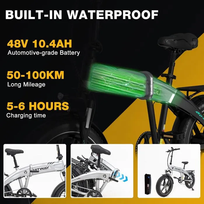Nom du produit HITWAY Vélo électrique VAE BK36 Pliable – 20″ x 4.0 Gros Pneus – Batterie Amovible 48V10,4Ah – Moteur 250W – 7-Vitesses – Noir