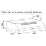 - Largeur : 90 cm, pour une zone de cuisson allant jusqu’à 90 cm de largueur.
