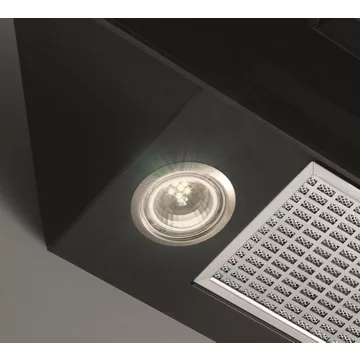 Une hotte élégante et performante :- Moteur Evo aux performances énergétiques et sonores remarquables- Double aspiration qui assure une grande efficacité d’aspiration grâce à 2 niveaux de filtration : un se situant sous la hotte, un derrière le verre- 3 vitesses (max : 640 m³/h) + Fonction vitesse intensive pour une aspiration maximale (730 m³/h) pendant 6 minutes, s’adaptant à vos besoins de cuisson- Commandes Sensitives pour un réglage facile du niveau de puissance et de l’éclairage- Eclairage LED alliant puissance et efficacité énergétique- Finitions verre noir avec inserts inox- A installer en évacuation ou en recyclage (kit de filtres à charbon x2 et kit de recyclage en option) – 2 filtres à graisse (nettoyage au lave-vaisselle)- Accessoires : kit de filtres à charbon (réf fabricant : 0449613), kit cheminée noir 2x500mm (réf fabricant : 5407008), kit de recyclage noir (réf fabricant : 0801329)- Existe en blanc