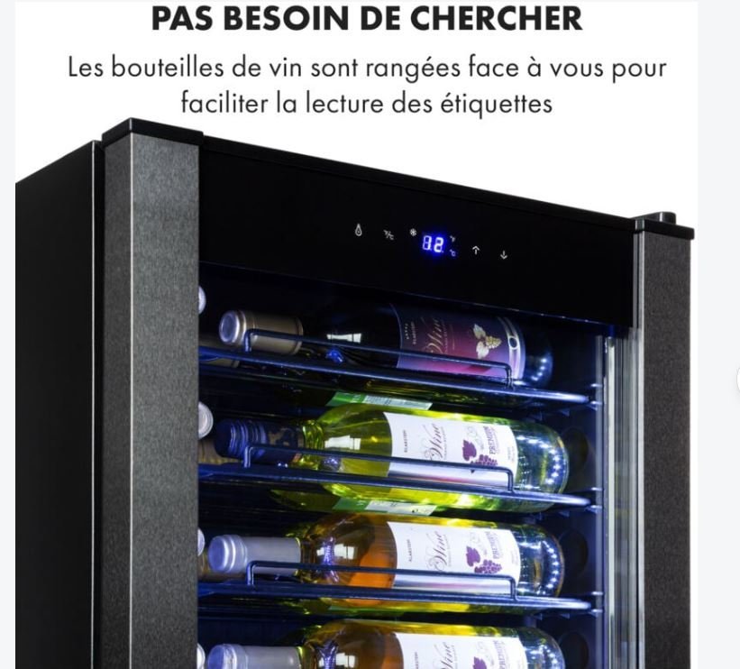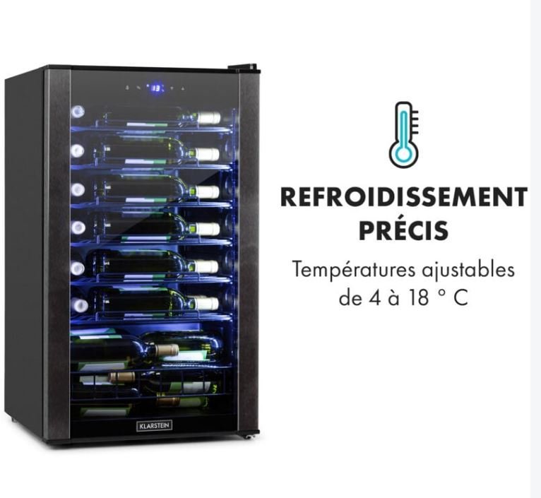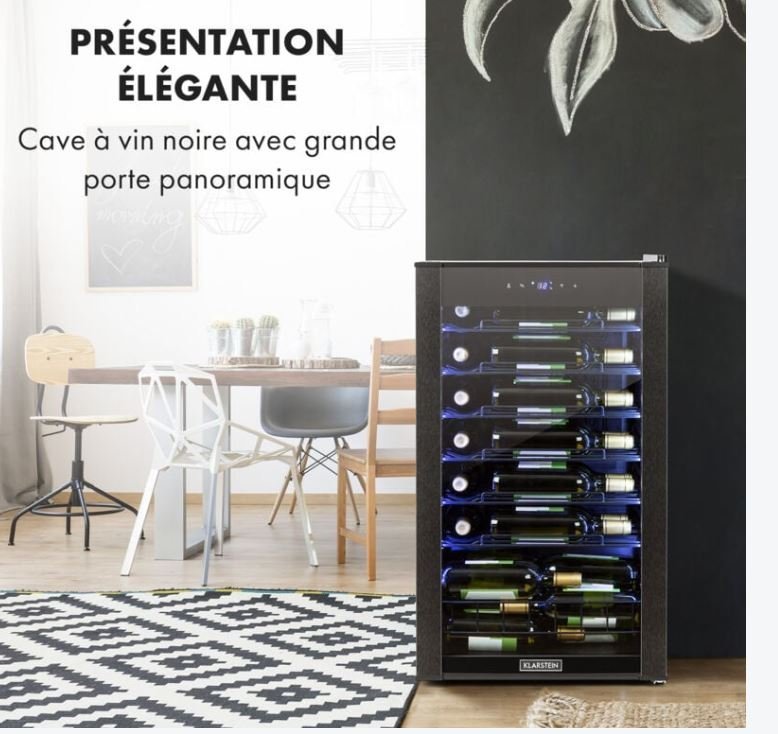 La cave à vin Klarstein Vinomatica 36 Uno est conçue pour offrir le meilleur plaisir du vin en maintenant vos bouteilles à la température idéale de dégustation. Son design élégant avec une porte vitrée panoramique permet de voir facilement les étiquettes des bouteilles, tout en ajoutant une touche esthétique à votre intérieur. Ce modèle peut contenir jusqu’à 36 bouteilles, offrant un espace de 95 litres, et dispose d’un panneau de commande tactile pour une utilisation simple.