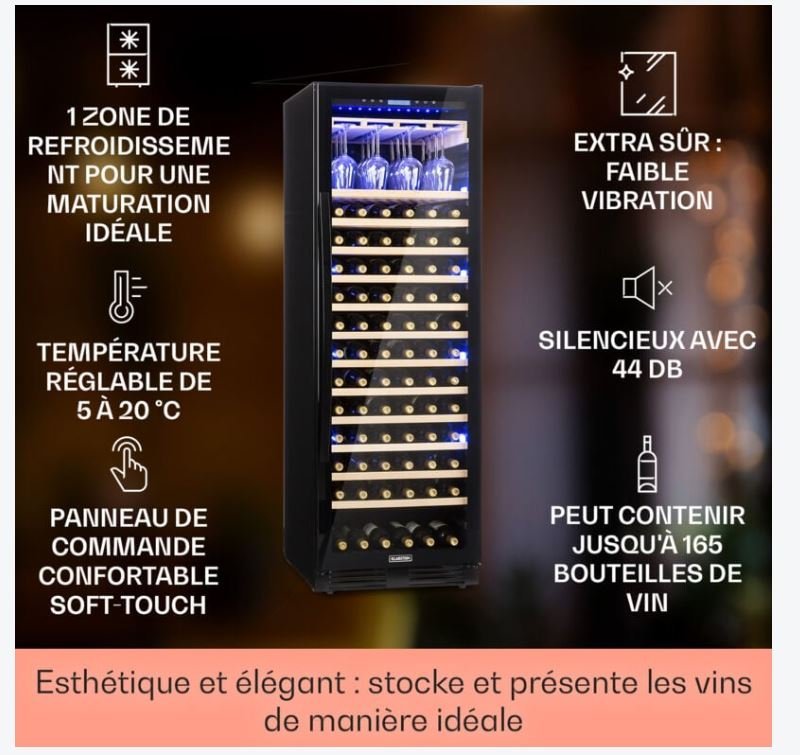 - Design élégant et présentation colorée : la cave à vin Vinovilla Grande 165 Built-In Duo Onyx Edition de Klarstein procure à vos vins la température de dégustation idéale et les met habilement en valeur dans une belle lumière. En plus de sa porte vitrée à cadre moderne, la Vinovilla Grande 165 Built-in Uno Onyx Edition séduit par son porte-verre à vin et garantit une dégustation parfaite dans des verres réfrigérés. Point fort : l’éclairage tricolore, qui met astucieusement en scène le contenu de la cave à vin.