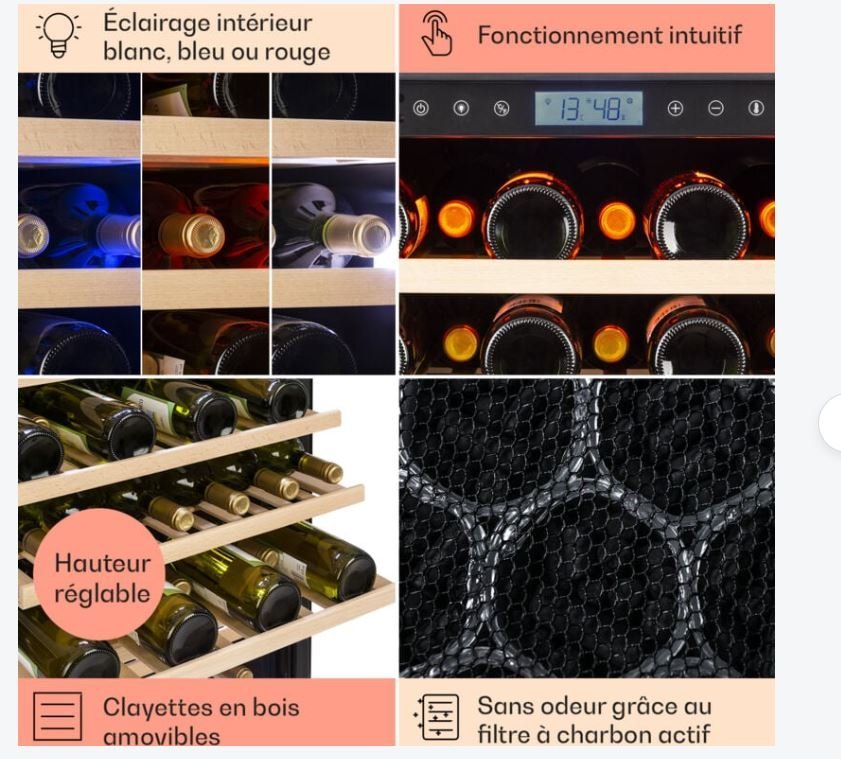 - Éclairage LED : 2 LED horizontales pour une lumière douce et une visibilité optimale des bouteilles.