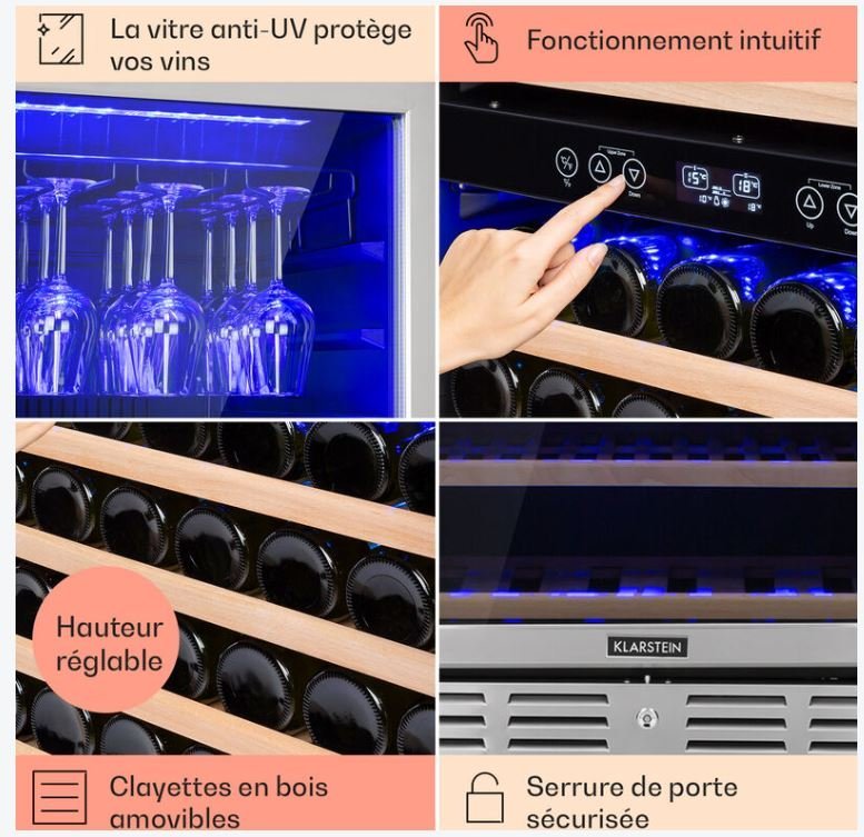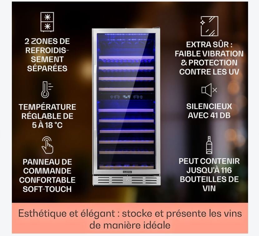 - Éclairage LED : 2 LED horizontales pour une lumière douce et une visibilité optimale des bouteilles.