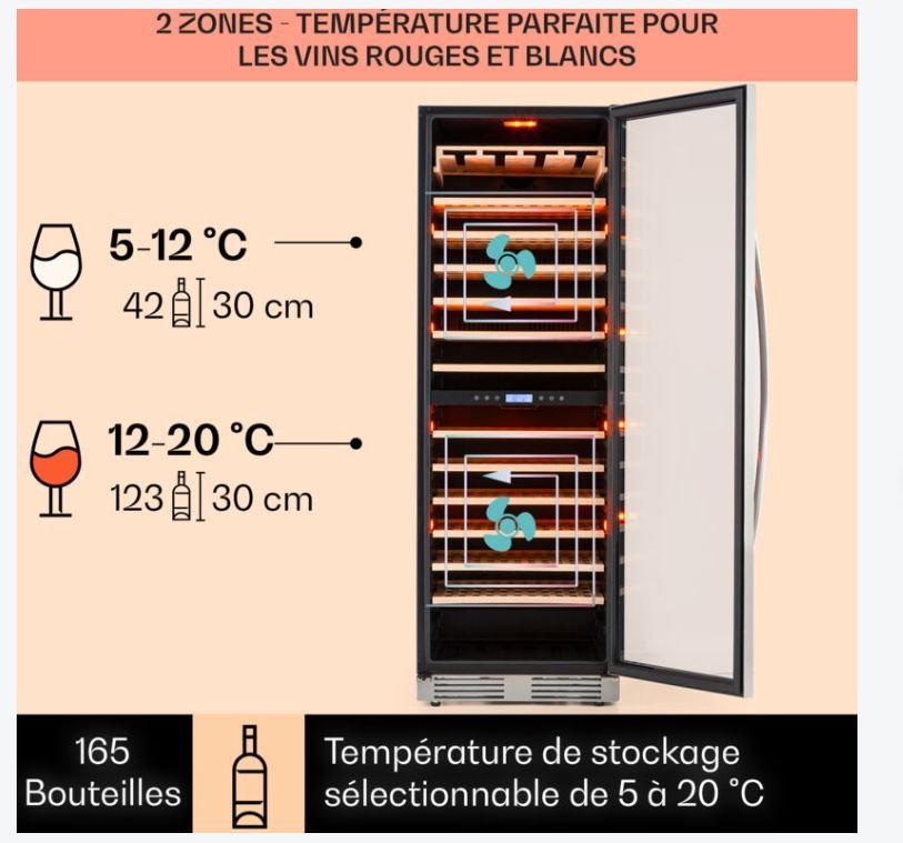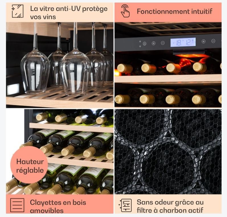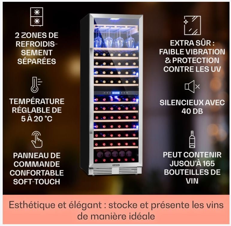 - Éclairage LED : 2 LED horizontales pour une lumière douce et une visibilité optimale des bouteilles.