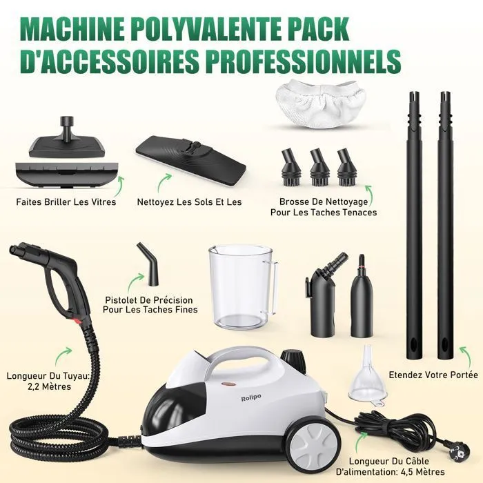 Nom du produit Nettoyeur Vapeur – 2000 W – 4 bars, câble d’alimentation de 4.5 mètres, Élimine jusqu’à 99,9 % des virus et, Nettoyeur à vapeur