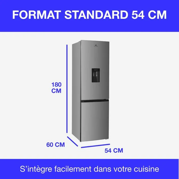 Nom du produit Réfrigérateur congélateur bas CONTINENTAL EDISON – 251L -Total No Frost(Sans givre) – Inox – L 54 cm x H 180 cm
