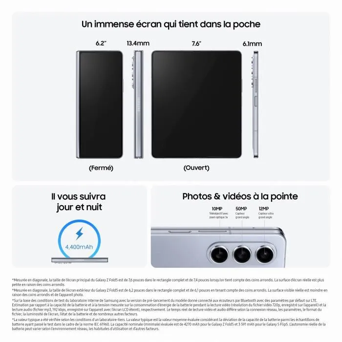 Caractéristiques Ecran Interne 7.6“ ; QXGA+ ; 2176 x 1812p ; 374ppp 120Hz adaptatif (1 – 120Hz) Dynamic AMOLED 2x Technologie Ultra Thin Glass Always-on Display HDR10+