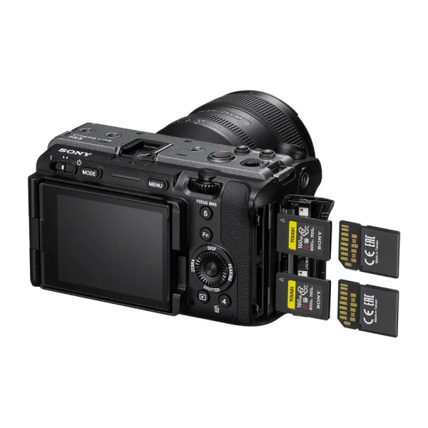 Les deux emplacements pour carte mémoire de la caméra peuvent accueillir les cartes CFexpress Type A et les cartes SDXC/SDHC qui prennent en charge les classes de vitesse UHS-I et UHS-II. Les cartes CFexpress Type A représentent le prochain standard de stockage compact. Dotées de vitesses d’écriture/lecture rapides, elles conviennent à l’enregistrement de vidéos 4K à des débits binaires élevés. Le double emplacement prend en charge les enregistrements relais et simultané.