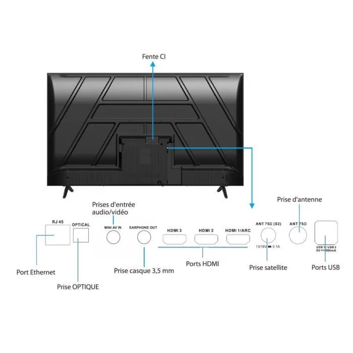 3 x HDMI.|1 x Port antenne.|1 x Port Satellite.|1 x Port Stéréo RCA.|1 x Port Jack/mini/Jack.|2 x Port USB.|1 x Port optique.|1 x Port Ethernet RJ45.