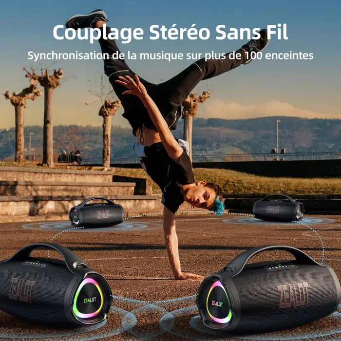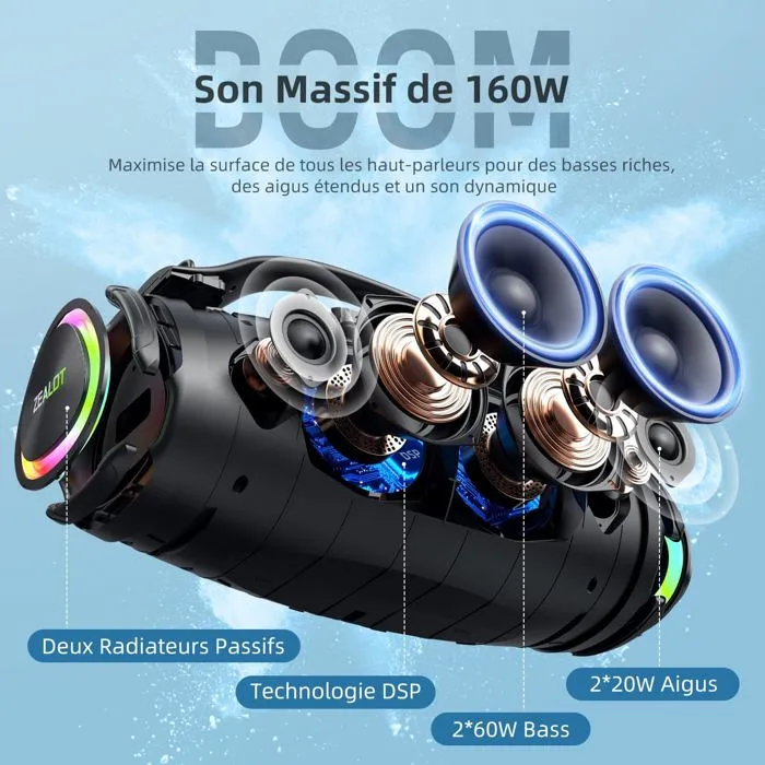 ZEALOT Enceinte Bluetooth 160W IPX6, Basses puissantes, Autonomie 40h, RGB, USB-C, AUX, Carte TF